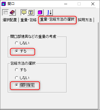 開口を入力する前に、「重量・包絡方法の選択」から「建具重量を考慮する」・「包絡方法は個別指定」を指定しておきましょう。