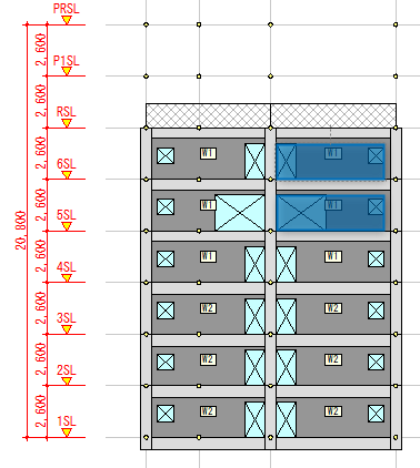 仮に6階の右側の壁を「包絡する」とした場合、青枠で囲った1つの大きな開口として認識されます。