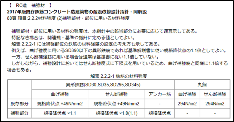 2001年基準では、異形鉄筋の材料強度を曲げ・せん断ともに降伏点強度+49N/mm2としていましたが、2017年基準より、補強部材の鉄筋材料強度は以下の通りとなりました。