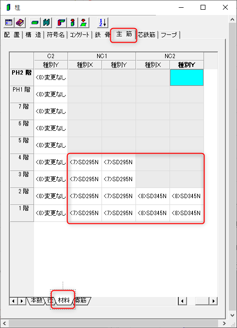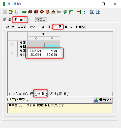 マウス入力の柱-主筋-材料の指定で、先ほど入力したデータを指定します。