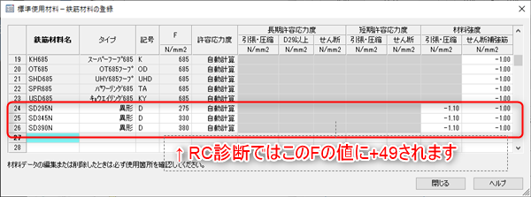 赤線を引いた強度で鉄筋を指定すれば、RC診断での計算時に降伏点×1.1倍の強度となります。